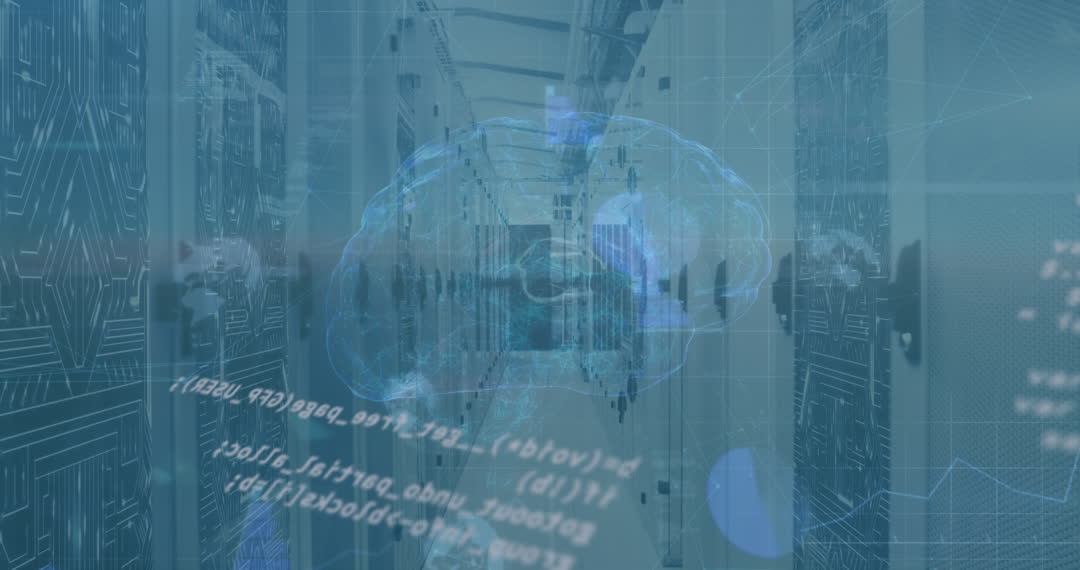Futuristic videory featuring a digital brain overlapping with a server room, illustrating concepts of AI integration and advanced data processing. Suitable for use in technology publications, AI research presentations, and IT service advertisements. Highlights themes of connectivity and intelligent systems.