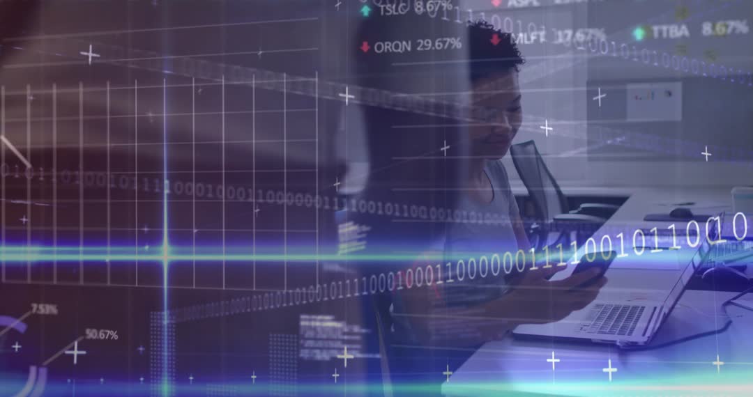 The scene captures three business professionals engaged in an innovative discussion within a glass conference room. Overlayed binary data signifies a focus on forward-thinking technological strategies and solutions. Ideal for depicting collaboration, digital innovation, and modernization in corporate environments, this video suits business, technology, and teamwork-related content.