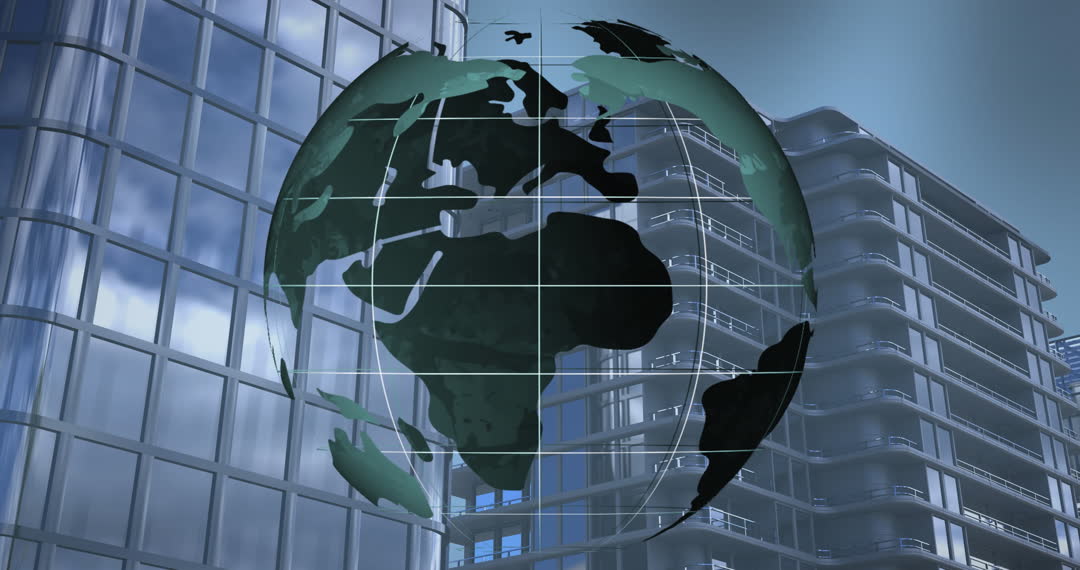 Animated depiction of global connections with a spinning globe overlaying contemporary architecture, symbolizing international commerce, technology, and data analysis. Ideal for use in presentations, business conferences, websites, or print materials focused on business growth, technology innovation, or global strategies.