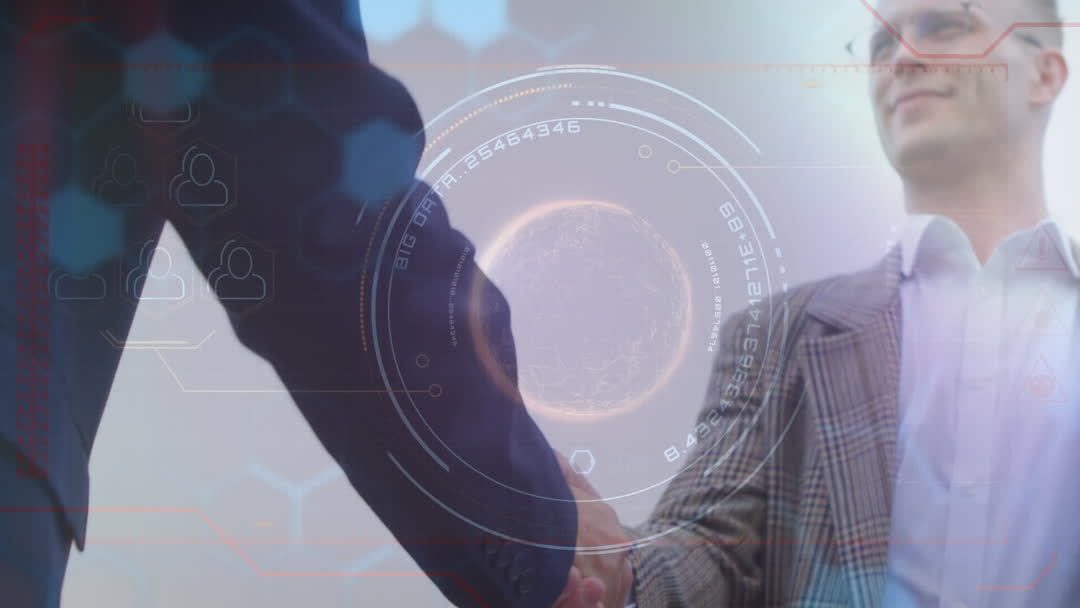 Digital Business Handshake with Futuristic Interface Overlay Video