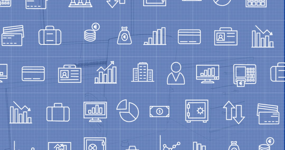 Visual representation of various business icons on a blue background. These include icons for finance management, statistics, banking, and corporate strategy. The aesthetic is ideal for presentations, digital marketing collateral, e-learning courses focused on business or strategy, and background in apps or websites related to economics or finance.