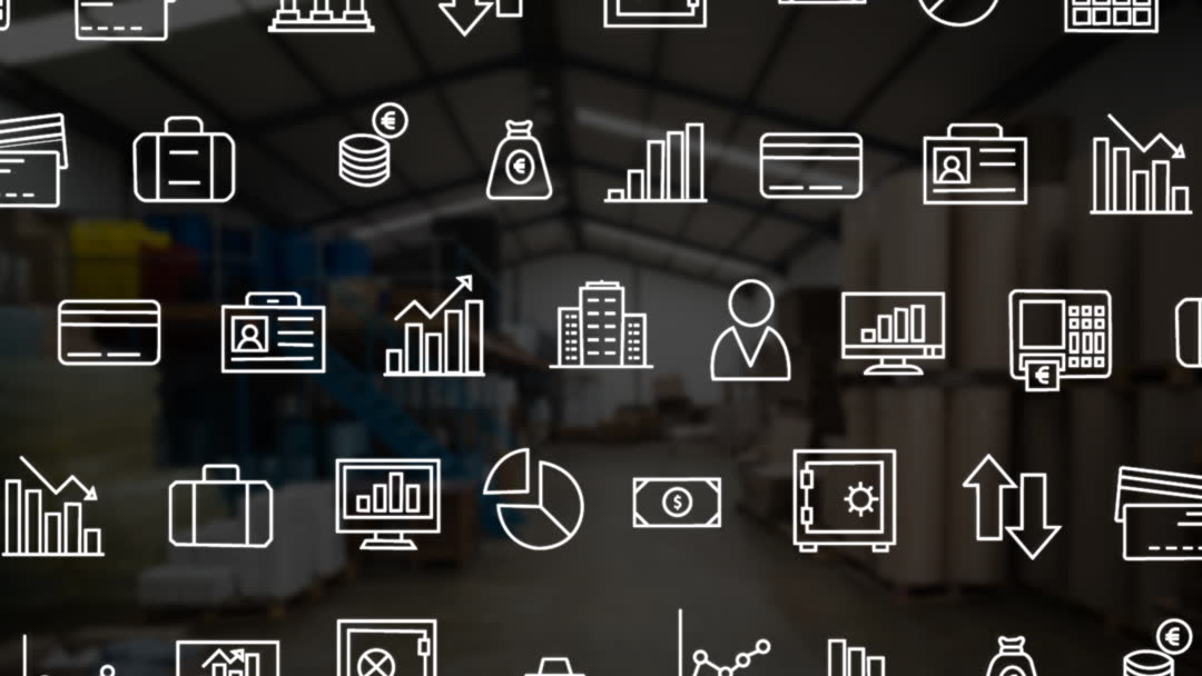 Digital Business Icons Overblurred Industrial Warehouse Background Video