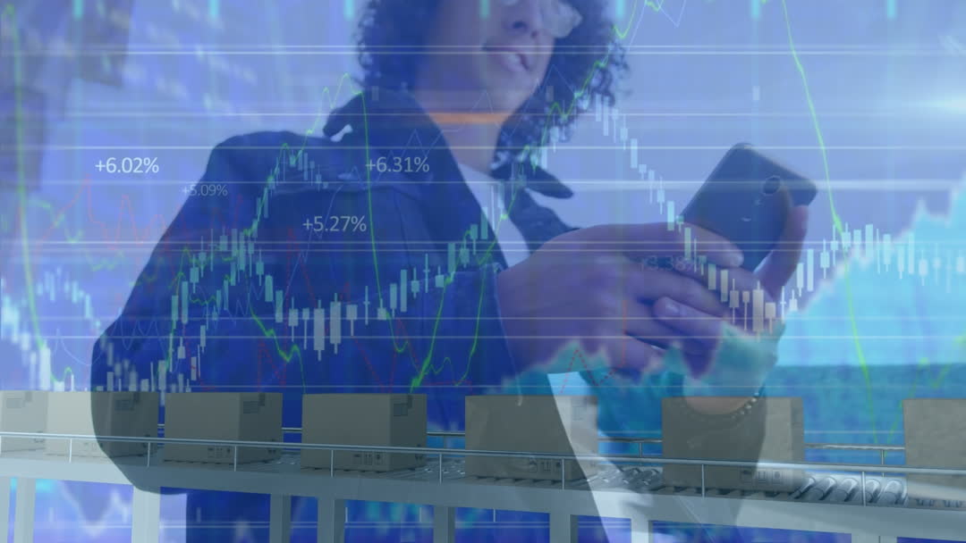 Animated overlay of financial graphs on man using smartphone emphasizes connectivity and real-time data access in business. Ideal for illustrating innovative business concepts, financial analysis, technological advancement, or the integration of mobile technology in professional settings.