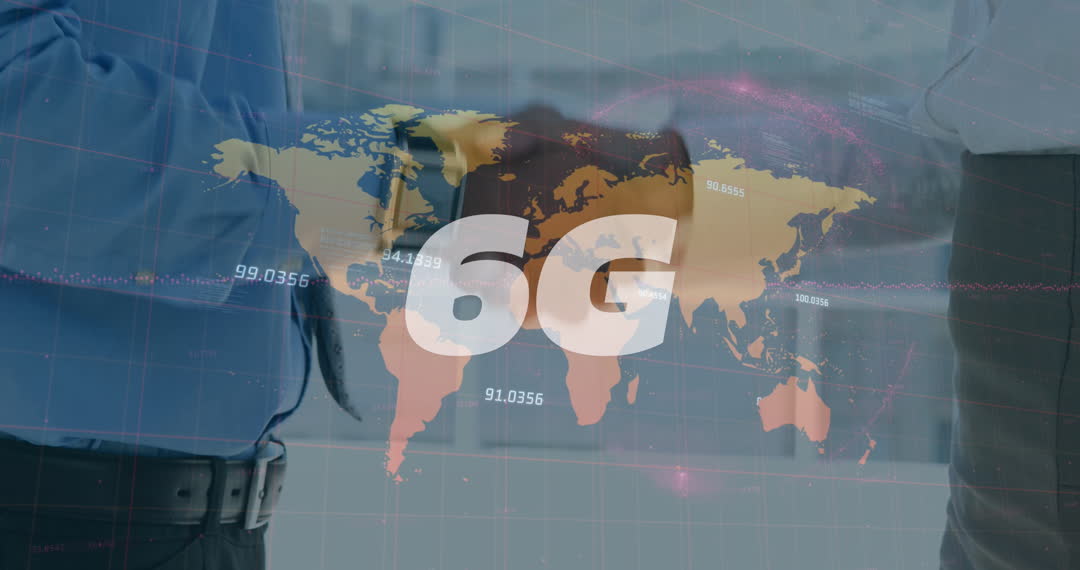 Graphic showing businessmen shaking hands against backdrop of world map and '6G' suggests global support and partnership in advancing this next-generation technology. Ideal for use in marketing materials promoting international cooperation, future technology trends, digital communication advancements or showcasing potential of 6G networks in business sectors.