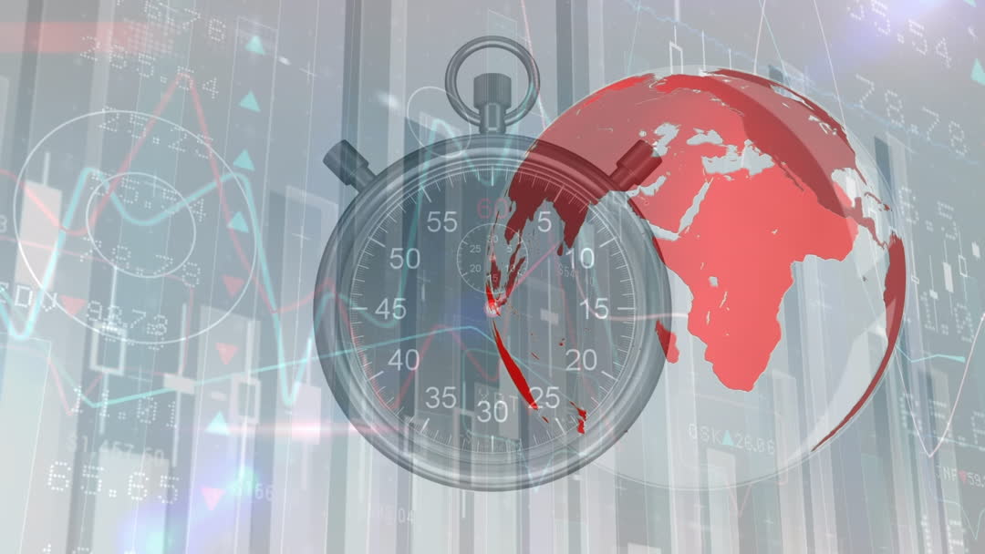 Visual demonstrating the fast-paced nature of global business, combining a stopwatch with digital data graphs. Effective for subjects like business analytics, global commerce growth, and time management in digital industries.