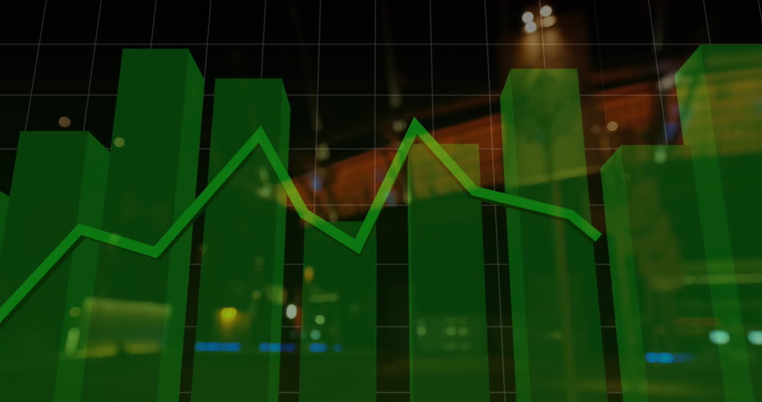 Intersecting digital line graph and bar chart overlaid on an urban background with two bicycles suggests progress or fluctuations typically used in business and market presentations. Ideal for illustrating financial trends, business analysis, or technology impacts. Suitable for global business articles or communicating city-based innovations.