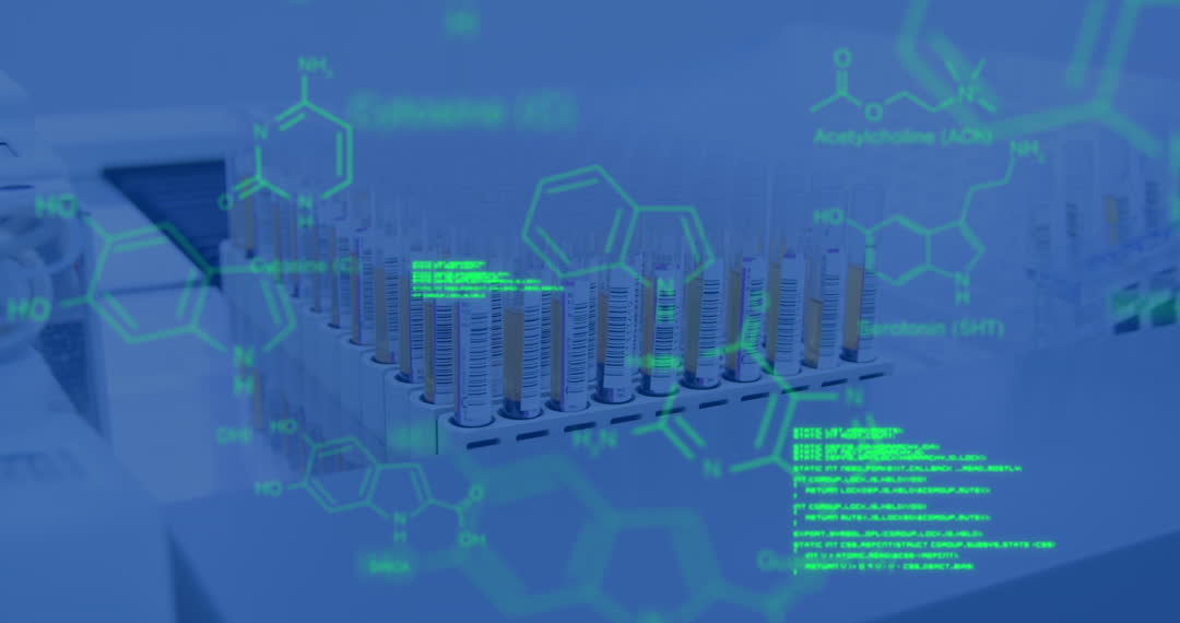This video depicts test tubes organized on a rack in a laboratory environment with digital chemical structures and data overlays in the foreground. Ideal for illustrating advanced research, lab technologies, data-driven science studies, biochemistry education, scientific advancements, and publicity for medical research labs.