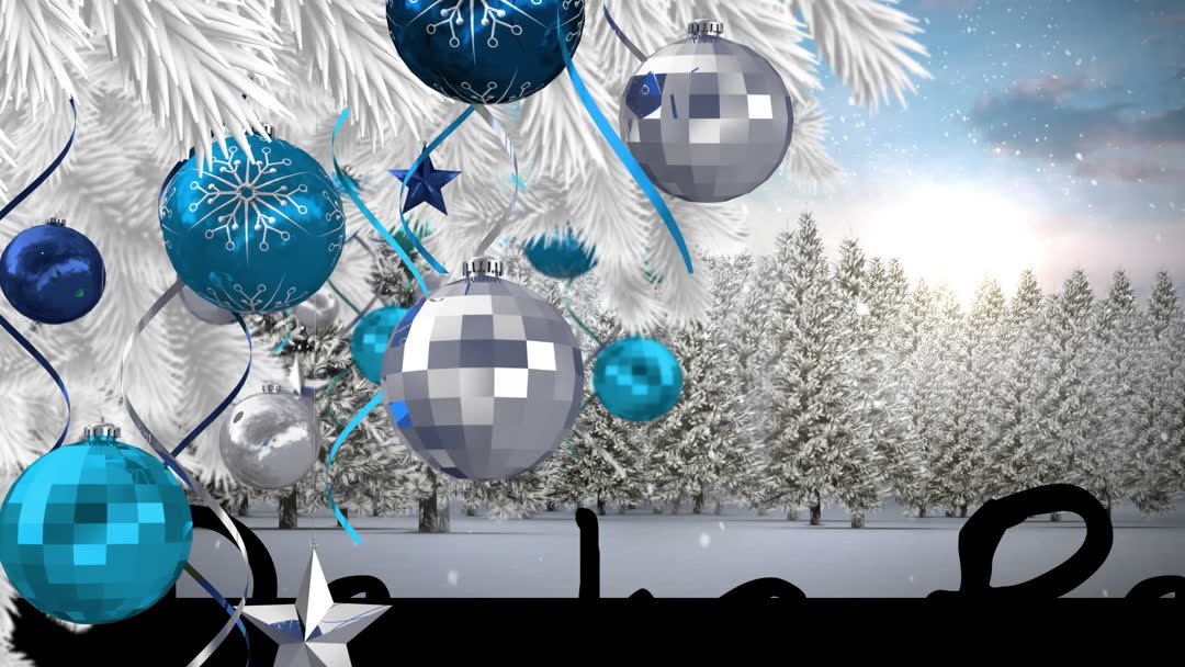 This digital graphic showcases a festive Christmas scene with falling snowflakes and hanging ornaments in silver and blue tones. The winter landscape in the background is covered with snow, reflecting the holiday spirit. Perfect for use in digital greeting cards, holiday presentations, or festive multimedia projects to enhance the seasonal atmosphere.