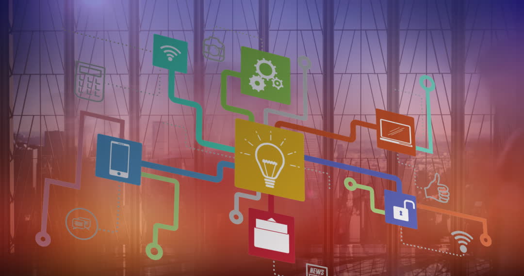 This illustration showcases a digital circuit board design overlaid with a COVID-19 theme. Symbols, including technology icons like Wi-Fi, mobile devices, light bulbs, and network nodes, blend into a colorful, futuristic interface. Ideal for use in presentations on technological advancements, digital banking, machine learning, public health strategies during the pandemic, or educational contexts analyzing impacts on healthcare.