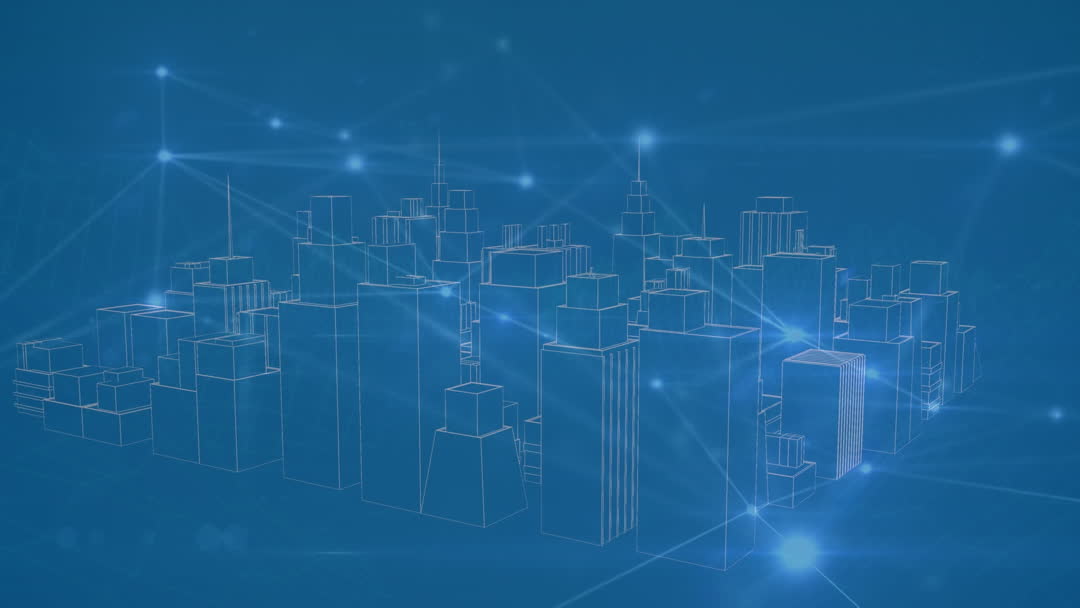 Illustration portrays a digital cityscape connected by a network of bright lines on a blue background, conveying concepts of digital interfaces, global business, communication networks, and technological innovation. Perfect for use in presentations about smart cities, emerging technologies, and futuristic urban planning.