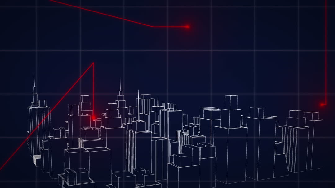 This digital animation depicts a futuristic cityscape with lines representing network connections against a dark grid background. Red light trails suggest a flow of data, symbolizing global communication and information technology. This visual can be used to illustrate technological advancements in urban areas or concepts like smart cities and data-driven environments.