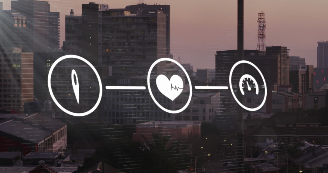 The video captures a cityscape at sunset with digital icons representing healthcare and transportation technologies. Heart pulse, GPS, and speedometer symbols connect the themes of urban living and modern solutions. This visual is ideal for use in presentations or articles about smart city innovations, health technology advancements, and urban development. It also resonates with themes of connectivity and efficient transit systems.