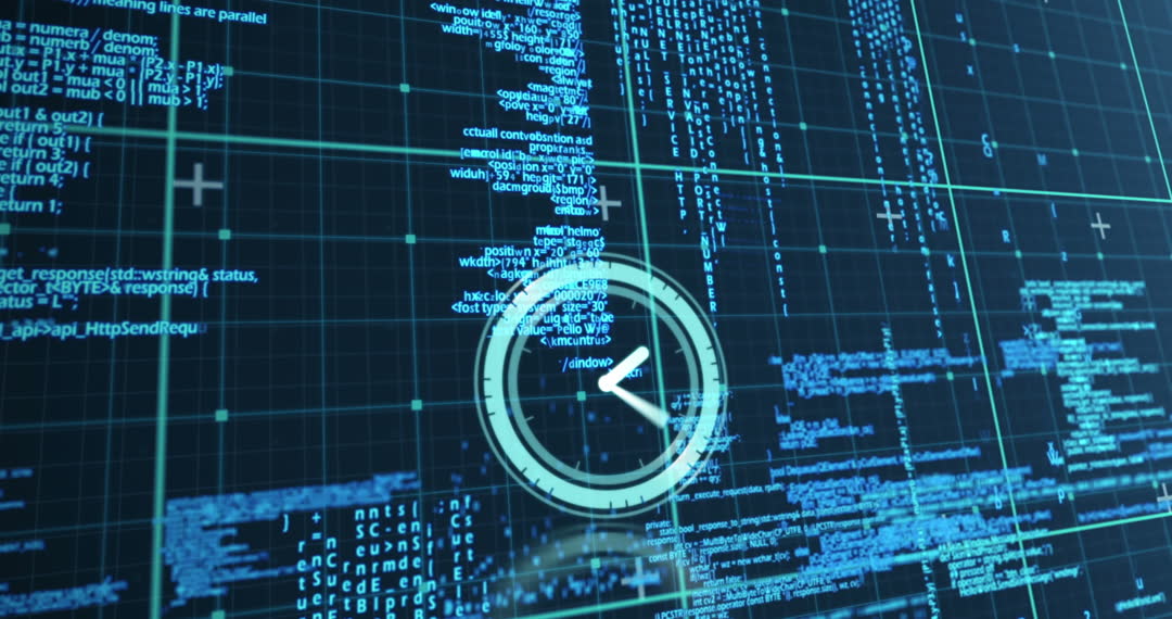 Clock animation appears alongside complex data elements, reflecting the interplay of time and technology on a futuristic digital interface in silicone navy hues. Ideal for illustrating concepts of digital governance, cybersecurity, or for use in technology presentations showcasing time-sensitive processing and data workflows.