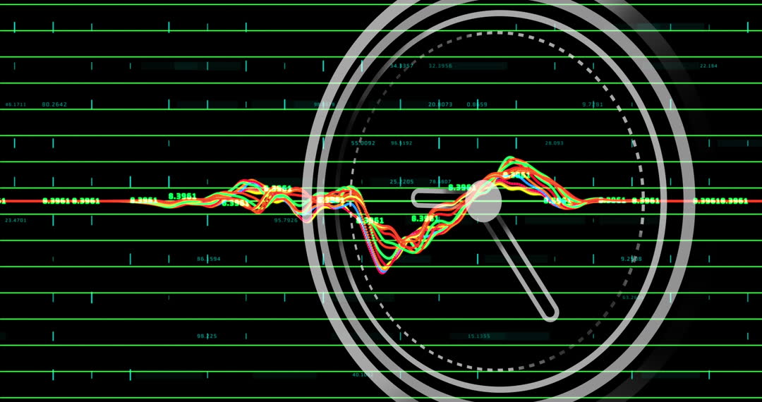 Energetic graphic depicting an animated clock overlapping data lines visually representing data processing and analysis elements. Perfect for illustrating business technology, fintech solutions, time management applications, and analytical software interfaces. Suitable for web design content and digital focused marketing materials.