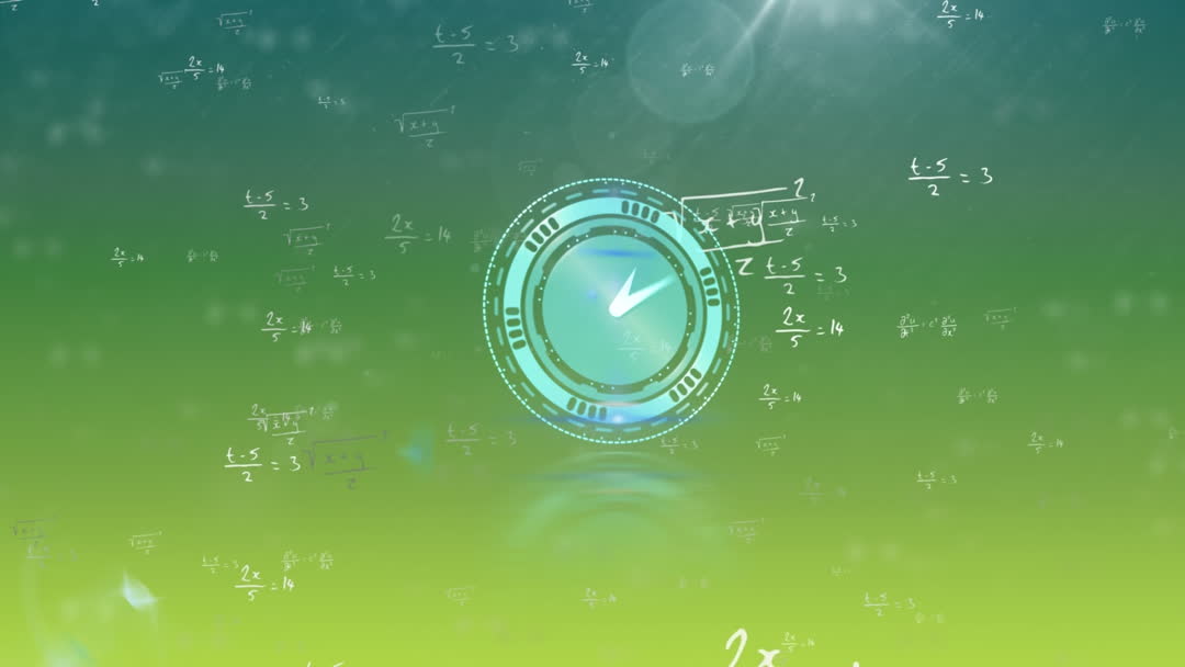 Animated visuals show digital clock surrounded by mathematical equations on green background, suggesting a blend of technology and education. Useful for presentations on innovative solutions, time management techniques, or educational content focused on mathematics and technology. Eye-catching background would suit marketing materials emphasizing digital strategy and scientific exploration.