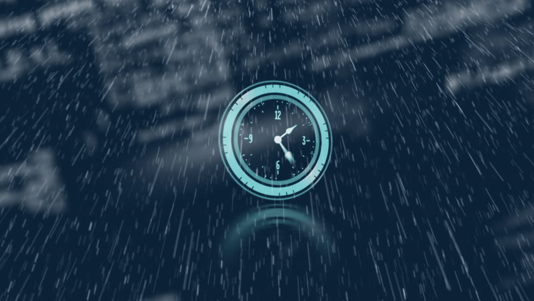 Digital animation featuring a clock displaying time with overlaid rain effect and faint data in the background. Symbolizes synchronization in digital technology or global data flow. Useful for technology presentations, business presentations, educational content on digital interfaces, or marketing materials for tech companies.