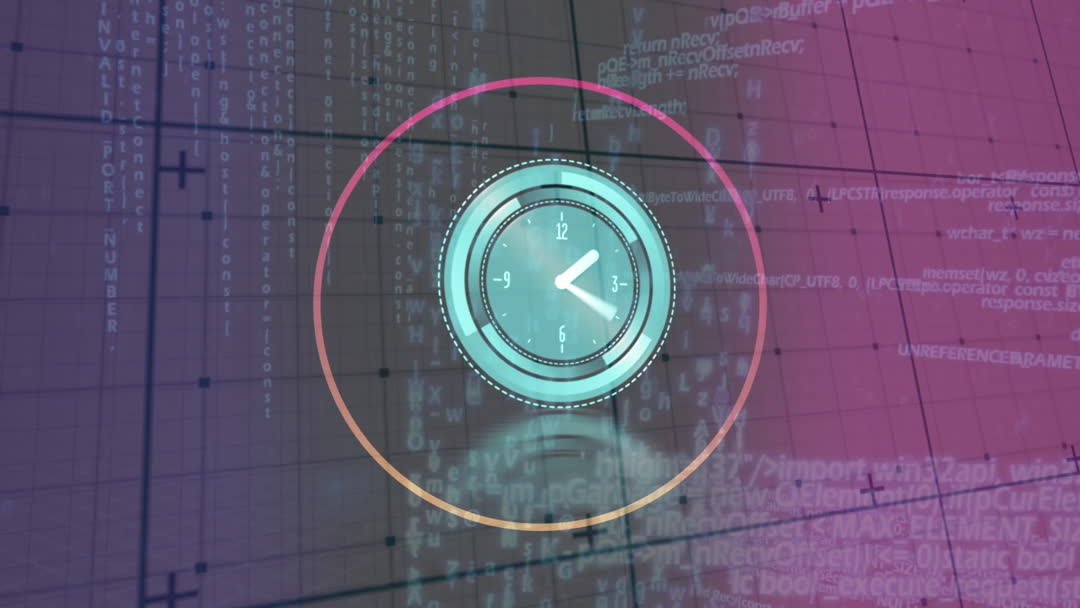 Animation features digital clock seamlessly integrated with data processing environment, showcasing high-tech concept with intersecting grids and digital scripts. Ideal for illustrating futuristic themes, technology integration, and global data applications in marketing materials, tech blogs, or educational content.