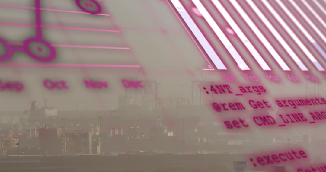 Dynamic blend of digital elements with industrial scene creates metaphor for modern data-driven economies. Useful for topics on global connections, financial analysis, digital innovation, or industrial progress.
