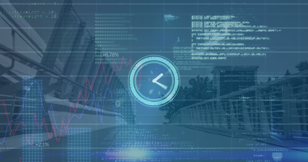 Innovative design combining a digital clock overlaid with analytical data visuals and a dynamic cityscape, conveying themes of technology, time, and data processing. Useful for illustrating concepts of innovation, modern business environments, or the impact of digital transformation in urban settings.