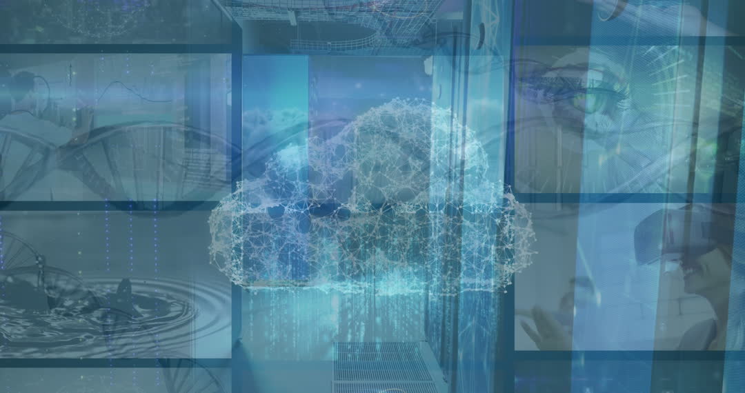 A visually striking illustration of a digital cloud with intricate network connections, overlaid on multiple digital screens displaying futuristic data videos. The videory represents modern advancements in cloud computing and networking technology. Suitable for presentations on digital transformation, technology companies' promotional materials, or articles discussing future tech developments and digital networking advancements.