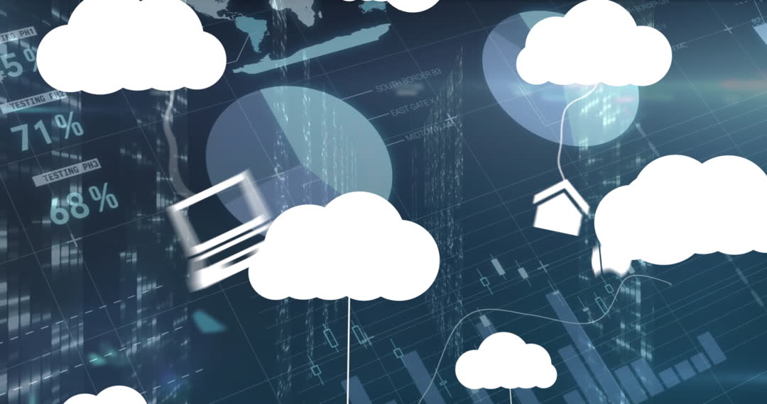 Graphic depicts cloud computing concepts, featuring cloud and digital icons overlaid on a background of data analytics and processing graphics. Ideal for representing modern digital technology solutions, data storage, and IT services. Useful for business presentations, technology blog visuals, and educational materials on data innovation.