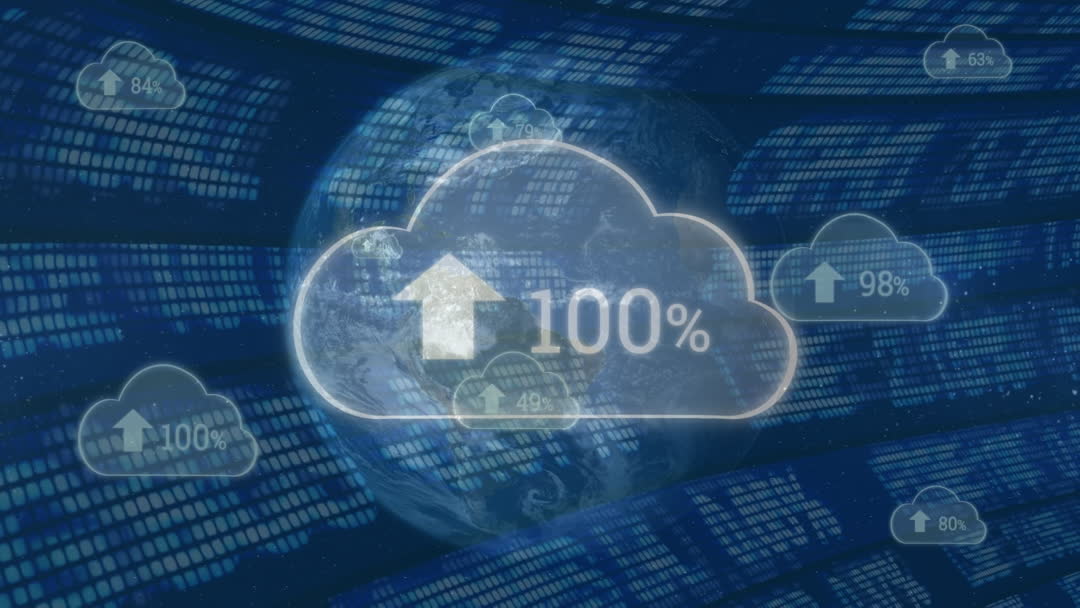 Conceptual design showcases concept of cloud computing and data processing with overlay text showing 100% upload, ideal for illustrating themes of global connectivity, internet technology, and modern data solutions. Suitable for presentations or articles on the digital transformation in the business or tech industry.