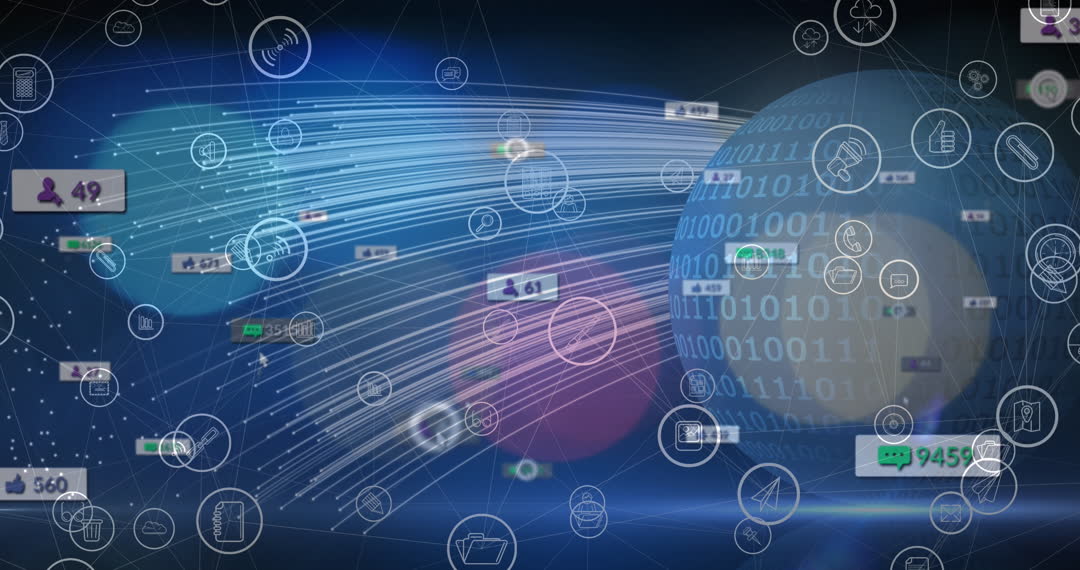 Binary code and globes suggest global data connectivity, effective for illustrating cloud computing and networking technology themes in presentations, websites, or marketing materials.