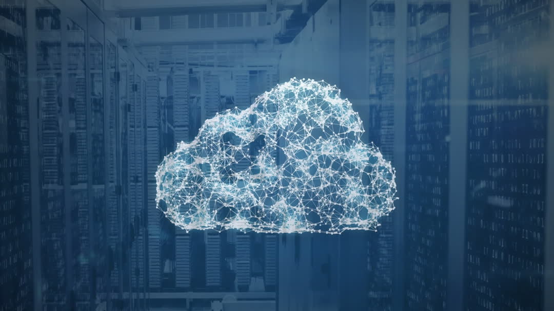 Digital Cloud with Data Nodes Overlaying Server Room Video