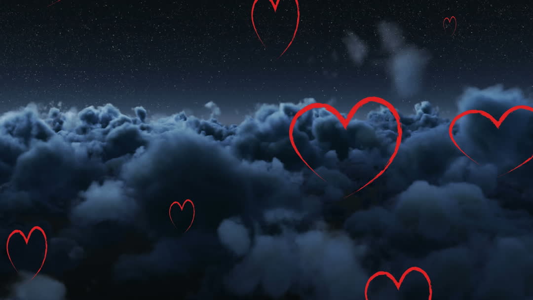 This digital artwork features a mesmerizing cloudscape with heart icons scattered throughout, set against a starlit night sky. A rotating safe lock icon symbolizes digital security and encryption, making this video ideal for projects related to online safety, cloud technology, and social media engagement. It evokes feelings of connection and protection, suitable for marketing campaigns, web design, or social media content.