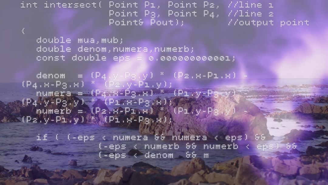 - Digital Code Overlay on Rocky Coast with Purple Sky