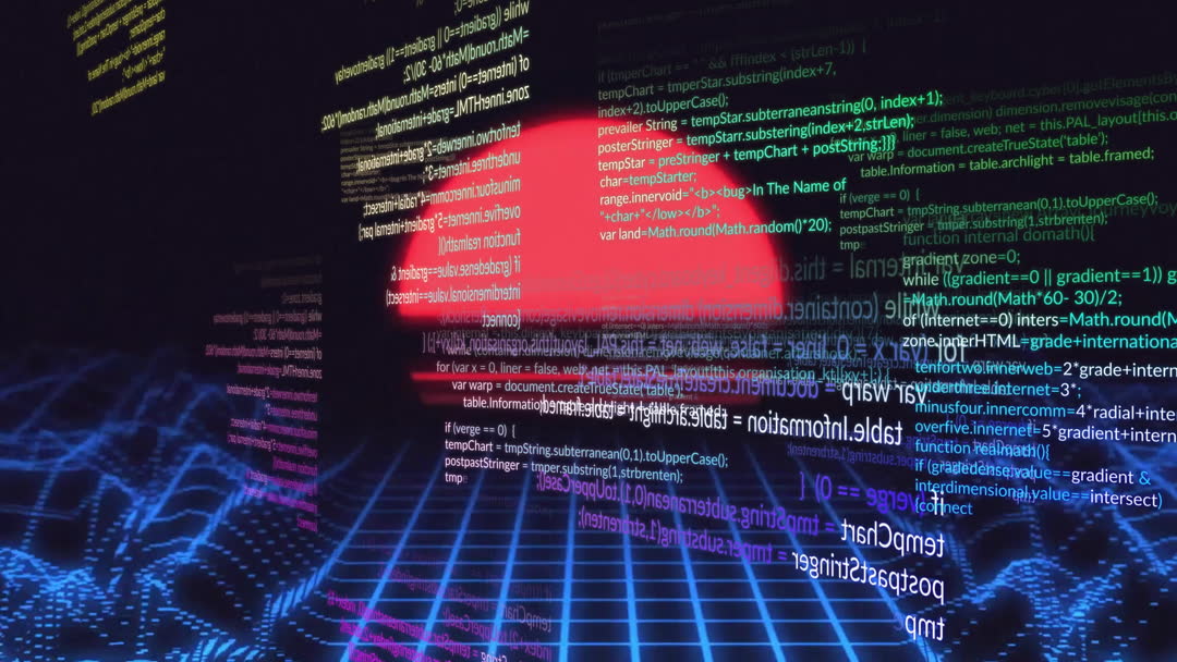 Colorful computer code floats across with a vivid red sunset softly visible against a grid. Useful for themes on technology innovation, programming advancements, future trends, unleashed potential, digital storytelling.