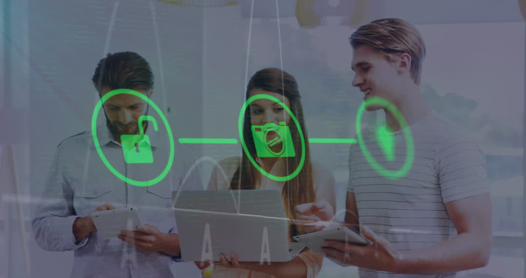 Young business professionals using laptops and tablets with digital media icons projected above. Shows concept of teamwork and data processing in a digital age. Great for illustrating themes of modern business collaboration, tech-driven offices, and interactive work environments.