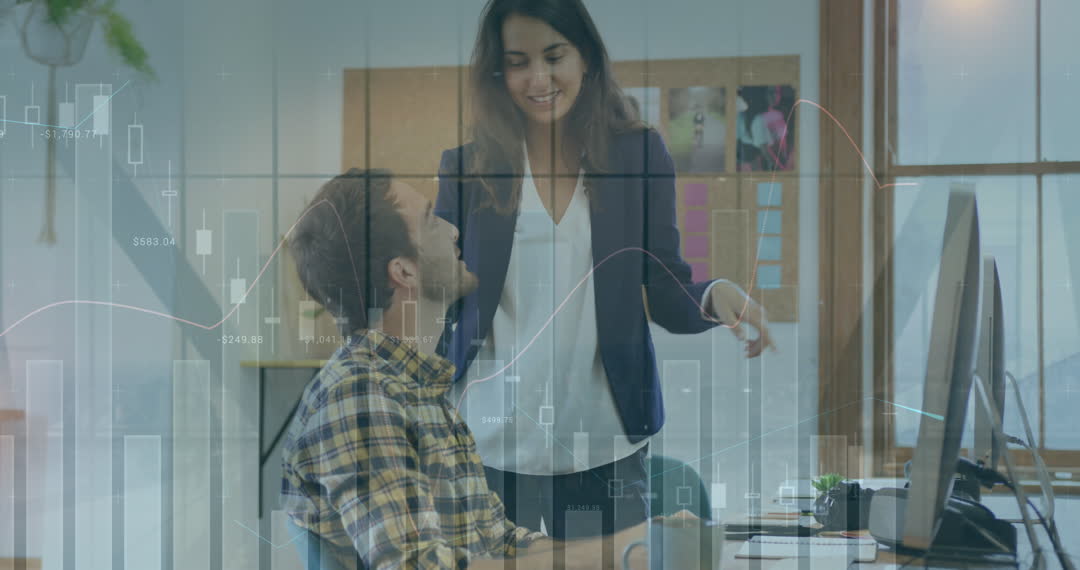 Business personnel collaborating with digital data visualization overlay in an office space. Perfect for showcasing modern business environments, teamwork, technological innovation, and analytics integration. Useful for illustrating connections between digital processes and human interaction in professional settings.