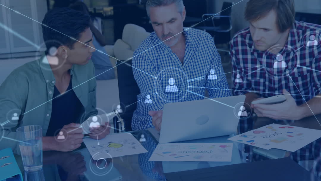 Three colleagues collaborating over computers with a digital network overlay symbolizing technology and connections. This video is useful for themes of teamwork, tech innovation, and digital communication in business contexts.