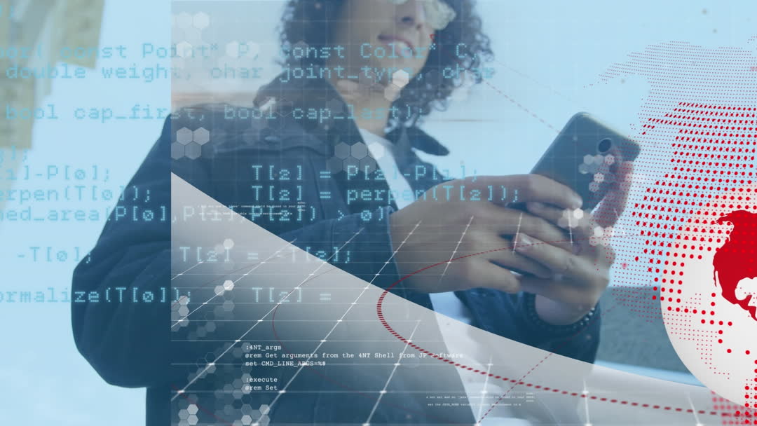 Dynamic scenecribes individual using smartphone with overlayed graphics of coding snippets and a global map. Highlights integration of mobile technology with global connectivity. Suitable for themes on data-driven technology, international business, innovative communication methods, and modern digital lifestyle for promotional content or educational materials.