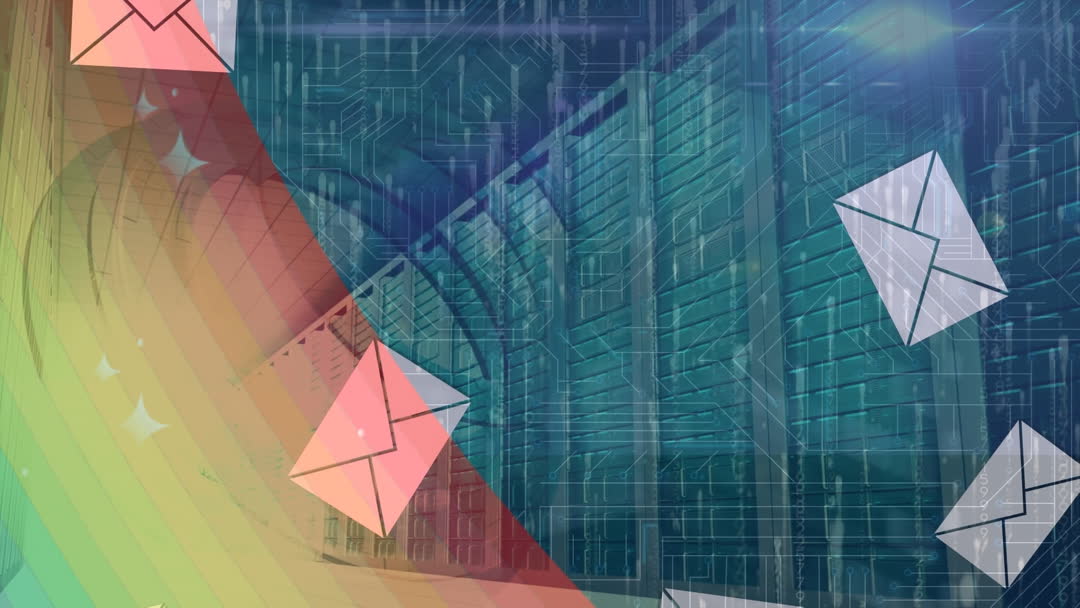 Abstract composition blending network videory with digital message icons flying over a server room backdrop. Captures the synergy between communication technologies and data storage infrastructure essential for modern businesses. Perfect for illustrating concepts in data transmission, IT solutions, or technical advancements in administering online messaging services.