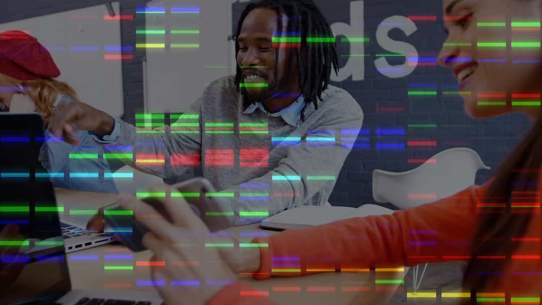 This visual portrays a modern and innovative office environment where a diverse group is engaged in discussion and teamwork. Incorporating digital overlays such as data lines and colorful graphics suggests themes of technology and communication. It can be used for business innovation recaps, tech company case studies, or collaborative work presentations.