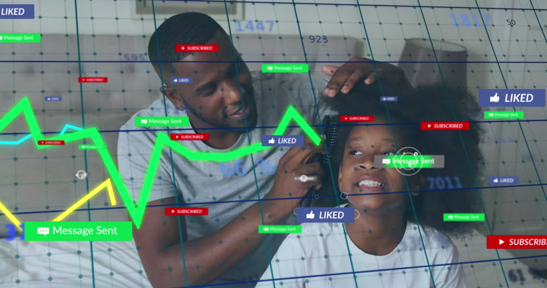 Visual blending digital interface symbols like graphs and social media icons with daily life shows interplay between modern technology and family interactions. This concept illustrates influence of digital communication on personal time, making it ideal for themes related to family life in digital age, technology impact, social media awareness, or modern communication strategies.
