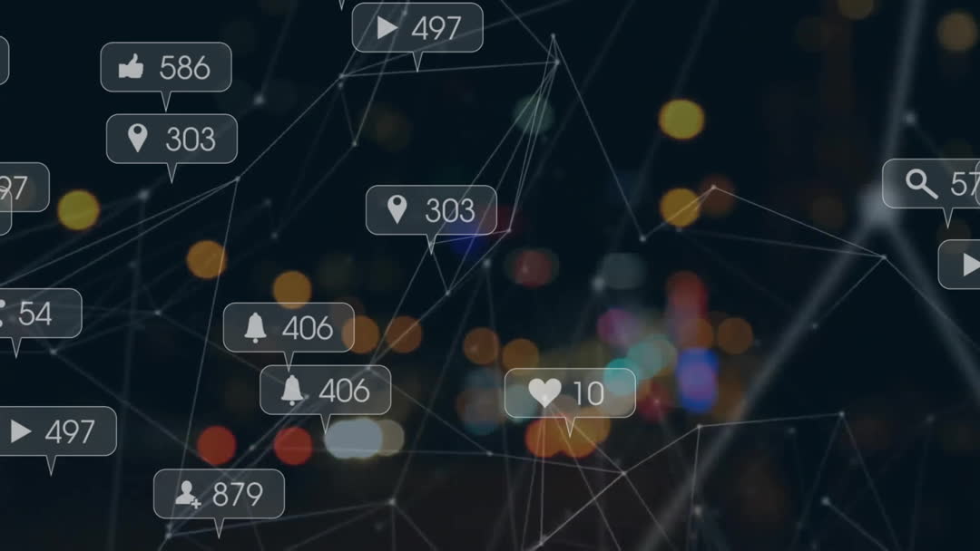 Blurry urban night traffic complemented by digital notification icons creates quirky juxtaposition of real and virtual worlds, perfect for concepts of modern communication, social media engagement, and technology integration in daily life.