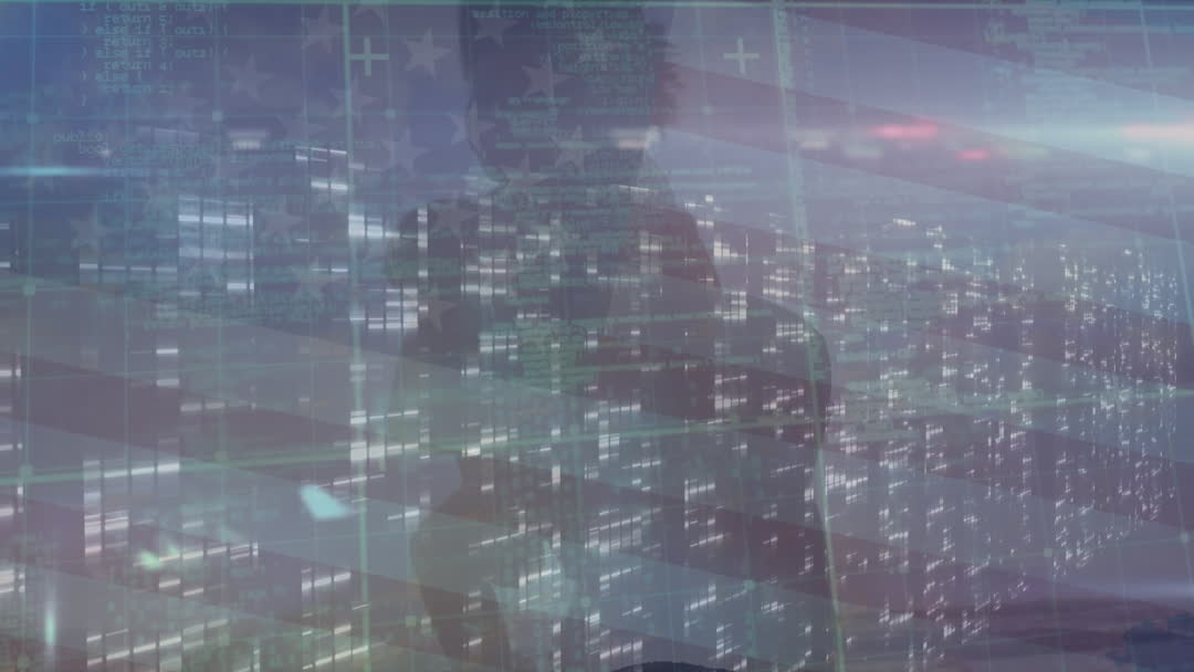 This video features complex data analytics with the American flag blended seamlessly over a cityscape. Ideal for use in tech-related projects, presentations about cybersecurity and data protection, or illustrating concepts of national security and urban technology transformation in an engaging way.