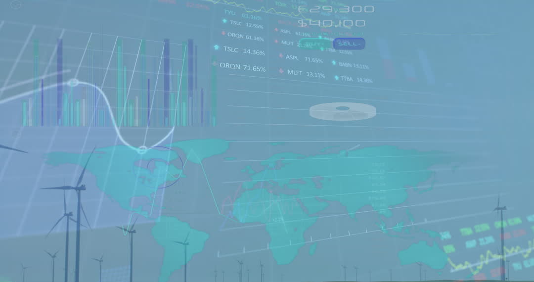 This visualization combines videos of wind turbines with financial graphs and world maps, showcasing themes like sustainable energy, global financial trends, and economic development. Ideal for illustrating articles or reports on renewable energy investments, global trade economics, and technological advancements in sustainable power generation.