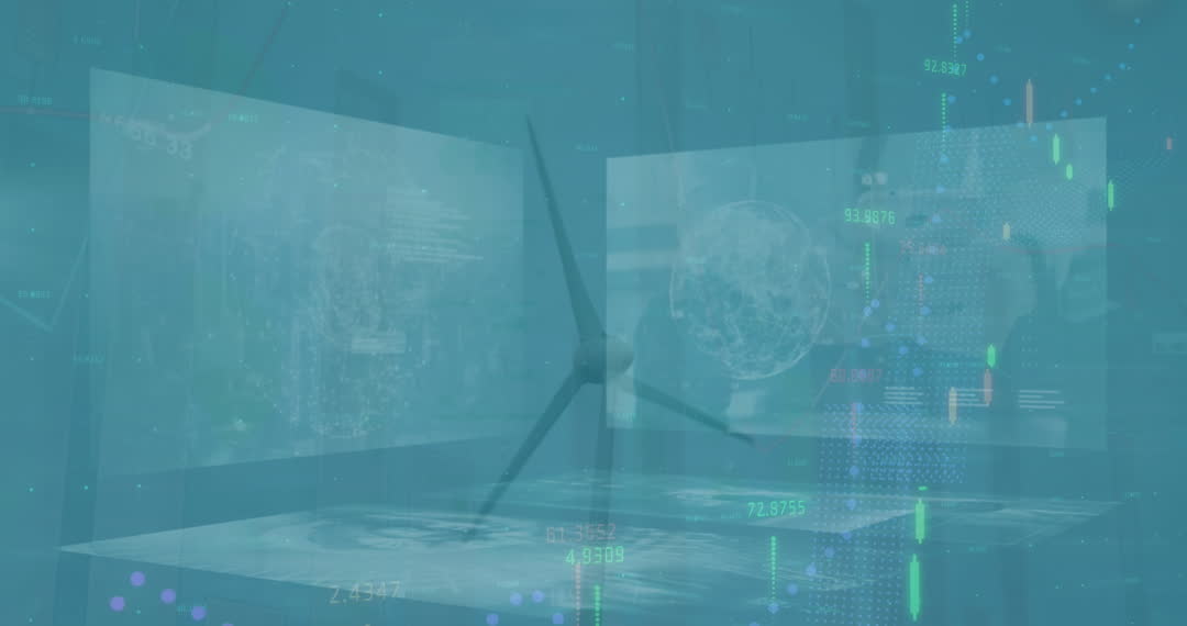 Videos of digital graphs and globes alongside a spinning windmill express the concepts of finance, globalization, and sustainable energy technologies. It conveys messages about technological advancements in renewable energy and global communication networks. Ideal for presentations on clean technology, sustainable finance strategies, and international collaboration.