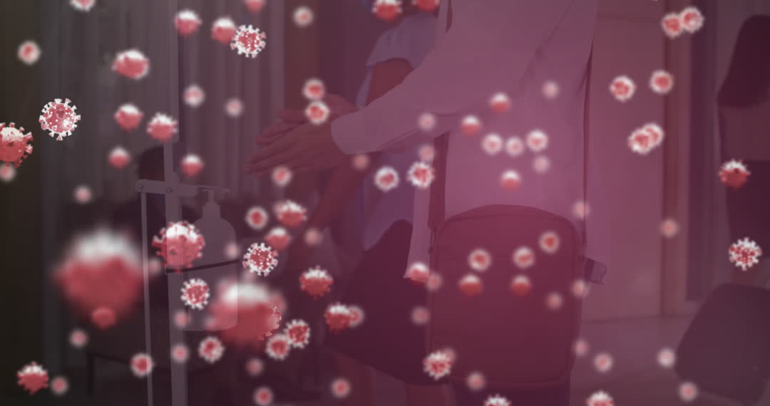 Digital representation of floating COVID-19 cells over people using hand sanitizer emphasizes the ongoing importance of health and safety measures in pandemic prevention. Useful for illustrating healthcare initiatives, informative campaigns on virus spread and prevention strategies, or educational content about public health and safety.