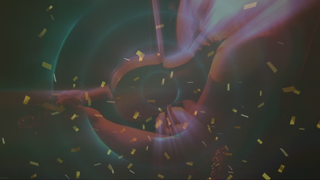 Vivid display of animated confetti cascading over radiant lights on a dark canvas. Ideal for use in music and entertainment contexts, celebration event promotions, digital backdrops, and creative multimedia projects looking to add a festive and dynamic element.