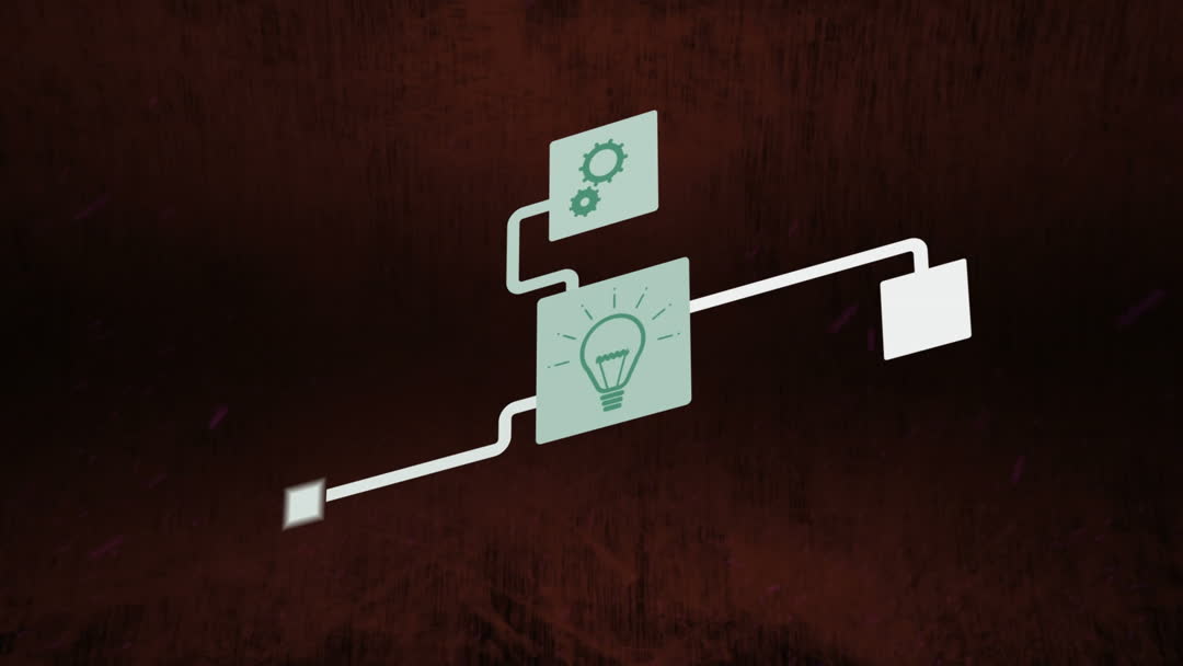 This graphic visualizes interconnected digital icons such as gears and a light bulb, representing ideas and technology on an abstract dark background. It can be used in presentations or multimedia projects focused on digital innovation, technological processes, or connectivity themes.