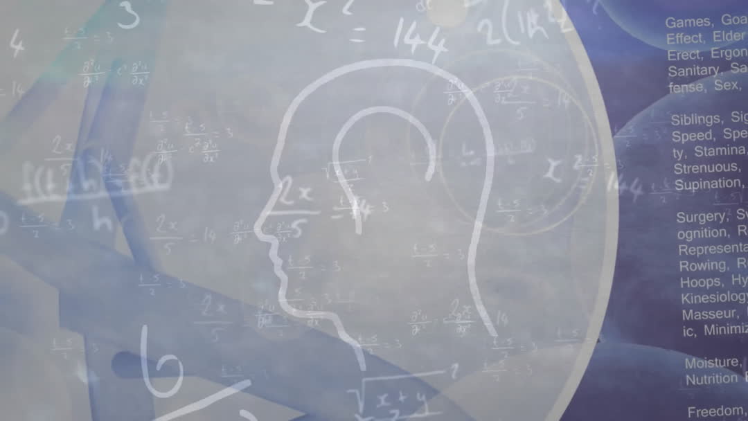 This digital graphic showcases a human head silhouette overlayed with complex data and mathematical formulas, representing concepts of digital connectivity, data processing, and technological advancement. It is ideal for use in presentations, articles, and marketing materials related to fields like computer science, artificial intelligence, and cognitive studies.