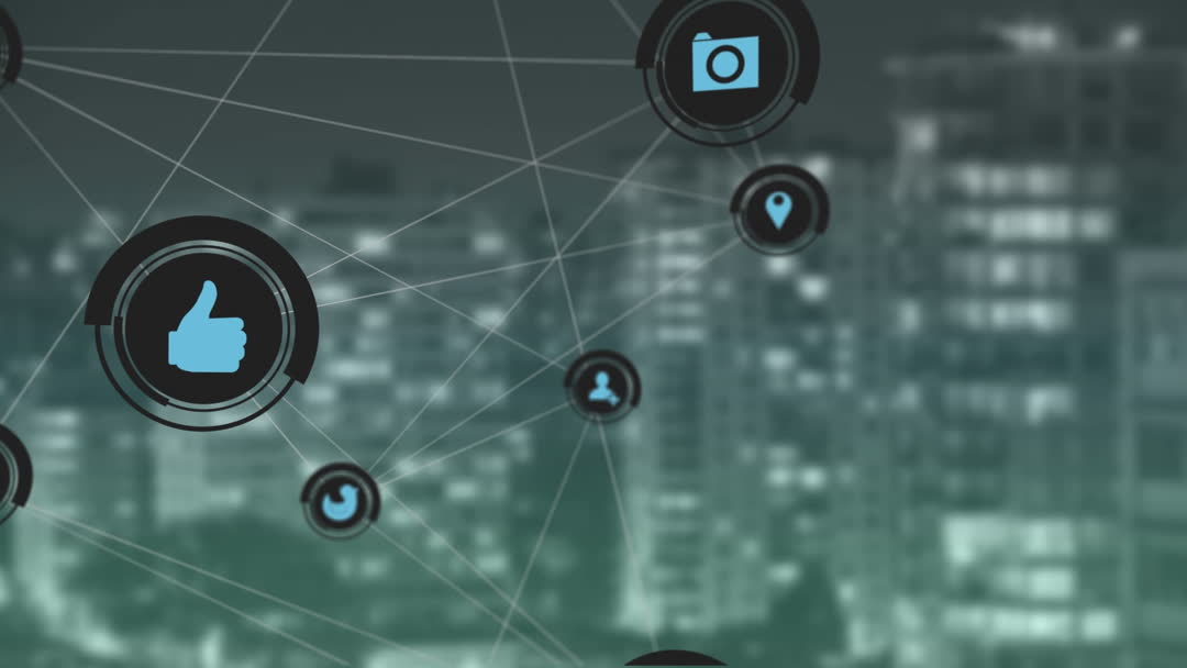This digital illustration depicts a network of connected social media icons overlaying an urban cityscape at night. Various icons on different nodes represent connectivity, communication, and the digital exchange of information. The video emphasizes themes of technology and digital networking, making it ideal for use in presentations, articles, or marketing materials focusing on urban technology advancements, social networks, and global communication.