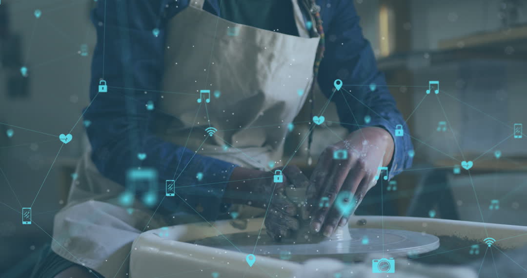 An African American woman in a workshop shaping clay on a pottery wheel, overlaid with digital connections and icons symbolizing global connectivity and technology. This mix of traditional crafts with modern technology represents innovation in artistic workspaces. Suitable for illustrating themes of creative industries, digital transformation, and art influenced by modern technology.