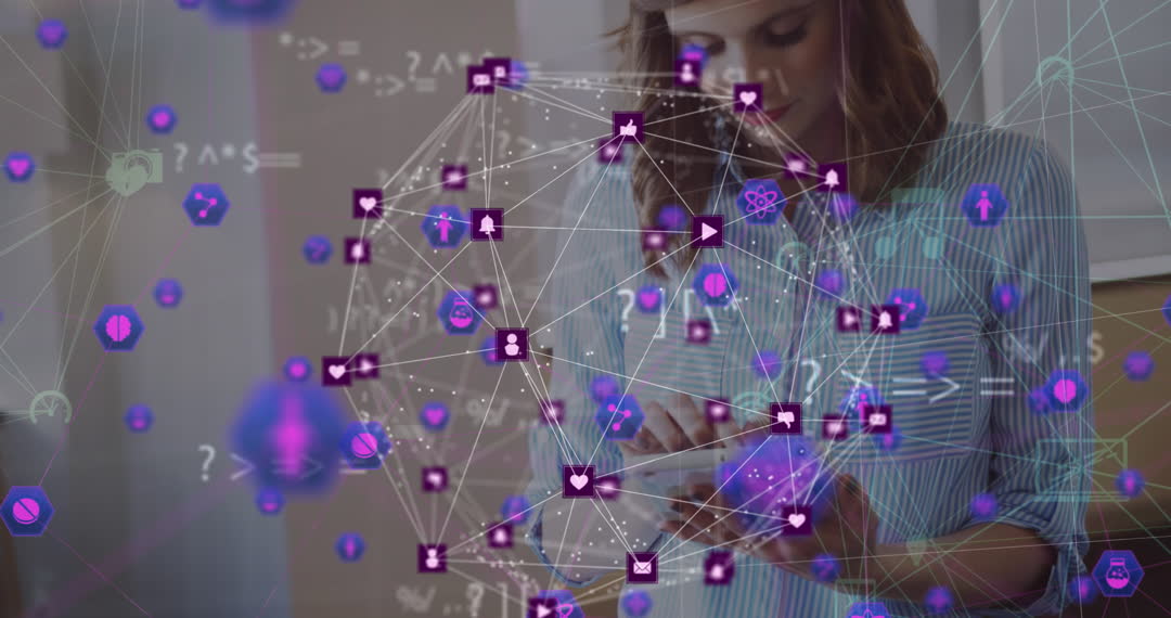 Abstract representation of a digital network with interconnected nodes and icons. Highlights concepts of global communication, technology integration, and social interaction through digital devices. Ideal for illustrating technological advancements, IT workshops, internet services, and social media marketing campaigns.