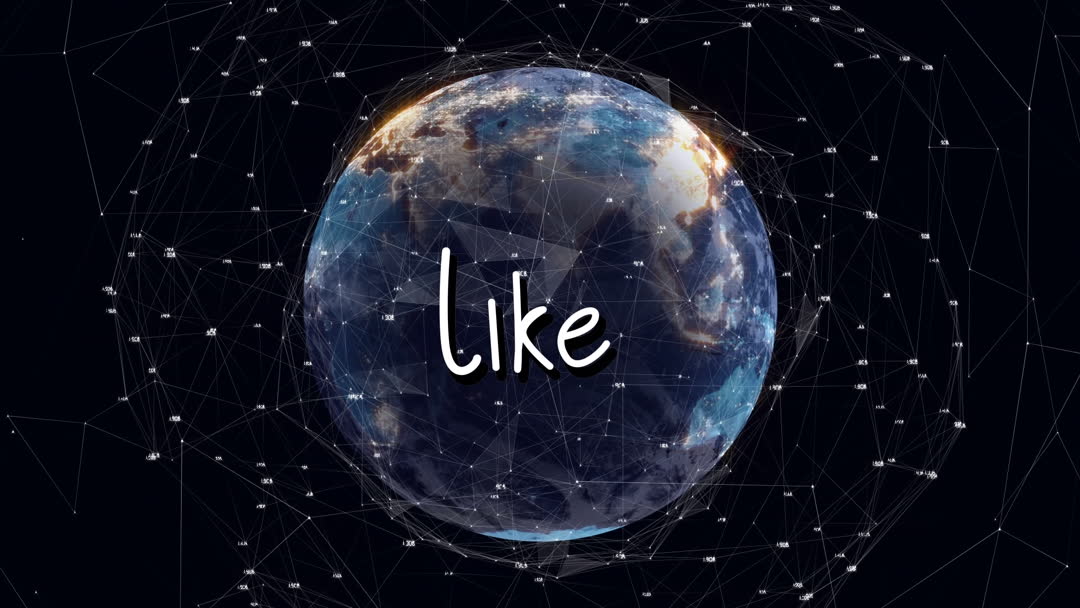 Animation displays globe surrounded by a digital network web highlighting global connections, with prominent 'like' text overlay conveying social media or communication themes. Useful for content related to international connectivity, online interactions, or social media marketing concepts.